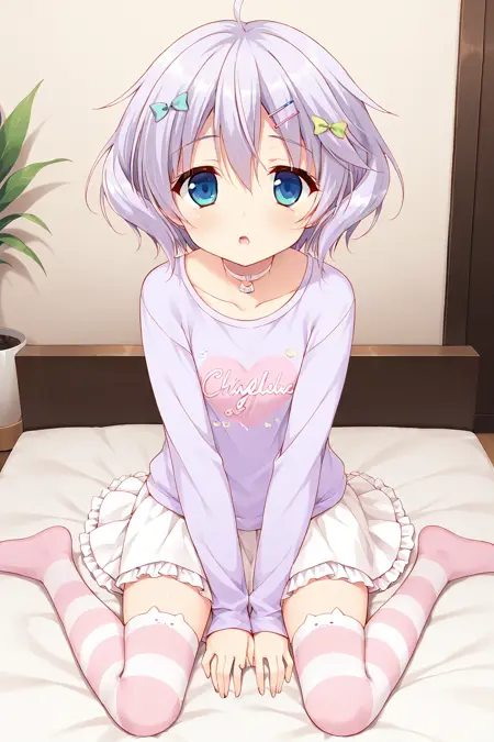 white choker,cat ornament,collarbone,purple shirt,t-shirt,long sleeves,print shirt,heart print,clothes writing,english text,white skirt,pleated skirt,frilled skirt,bow skirt,purple bow,zettai ryouiki,striped thighhighs,