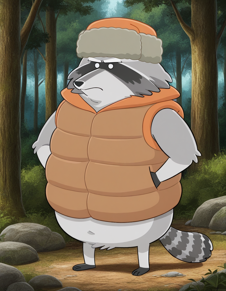 Randl, male, raccoon, gray fur, little limbs, beady white eyes, no pupils