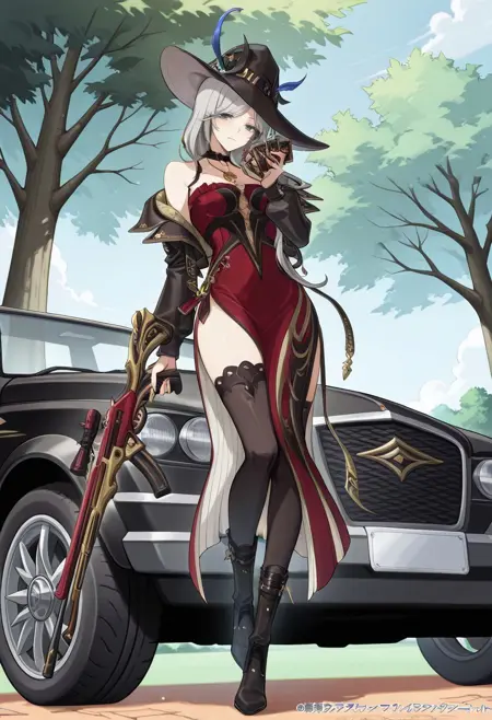 1girl, Galatea-Default, long, wavy silver hair, green eyes, a wide-brimmed black witch hat adorned with a blue feather, a form-fitting, high-slit red dress with gold and black accents, revealing her legs, Over the dress, an elegant black and gold off-shoulder jacket with intricate embroidery and a quilted inner lining, A golden pendant hangs from her neck, heeled boots with gold buckles, outfit and accessories blend elements of fantasy, witchcraft, and tactical gear,