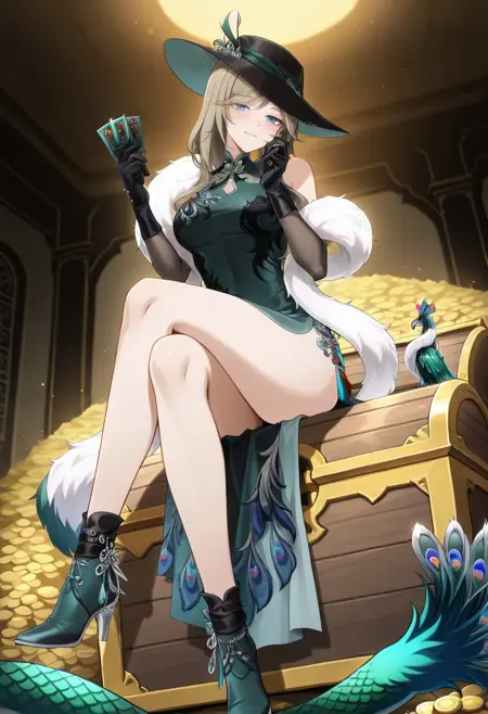 1girl, Galatea-Peacock, long, wavy light brown hair and blue eyes, an elegant dark green qipao dress with peacock feather embroidery, a black wide-brimmed hat decorated with a green ribbon and lace, long black gloves, a white fur shawl draped over her shoulders, high-heeled ankle boots with silver details,