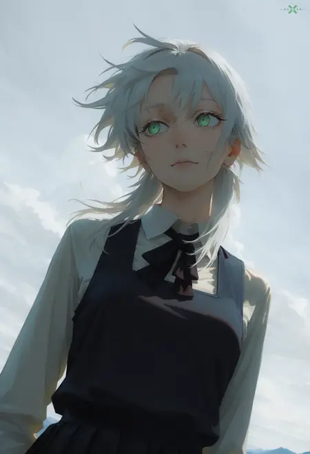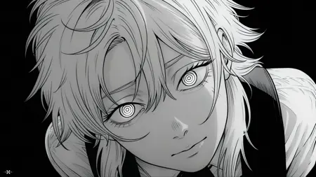 デッドデビル、チェーンソー・マン、輪状の目、白髪、緑の目、黒いリボン、黒いエプロンドレス、汗、乱れた髪、1人の少女
