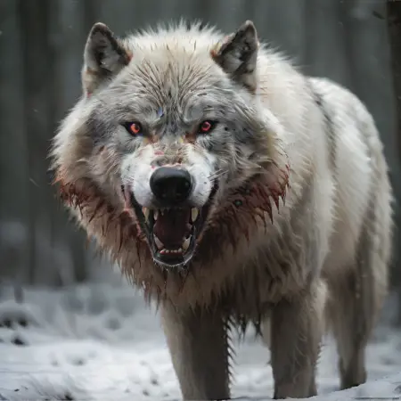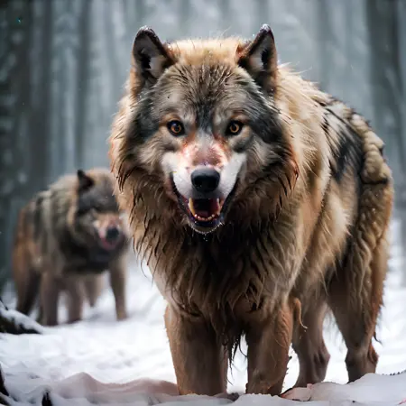 animal focus, black wolf, blurry, blurry background, brown wolf, depth of field, dire wolf, distant shot, fangs, grey wolf, looking at viewer, multiple wolves, open mouth, orange eyes, realistic, red eyes, solo, teeth, tongue, whiskers, white wolf