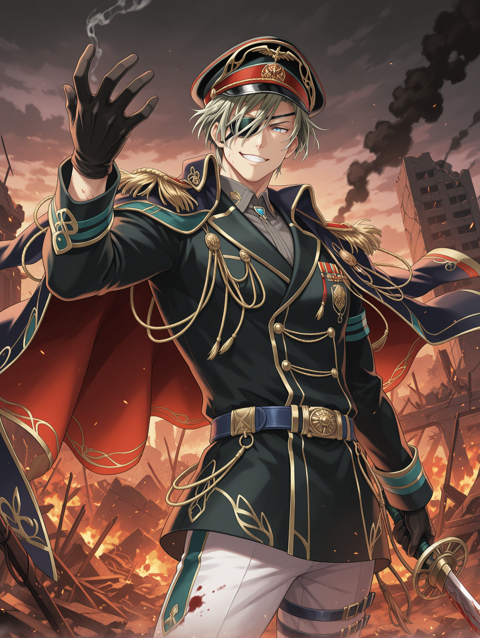 eyepatch, black/white peaked cap, epaulettes, cape, furtrim, black/white gloves, brooch, ascot, epaulettes