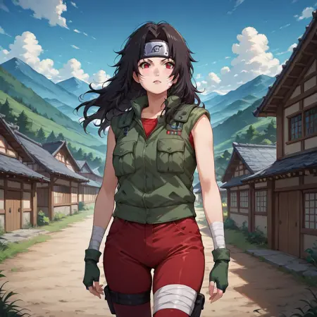 【上忍衣装プロンプト】: Jonin_Outfit, 緑のフラックジャケット, 赤いシャツ, 赤いズボン, 脚巻き, 足趾露出型靴