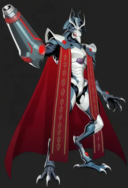 r4v3n, bird boy, eye scar, armor, helmet, arm cannon, red cape,