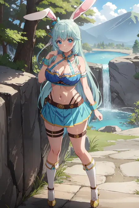 衣装:胸元の露出、腹部の露出、プリーツスカート、太ももストラップ、膝丈ブーツ、手首のカフス