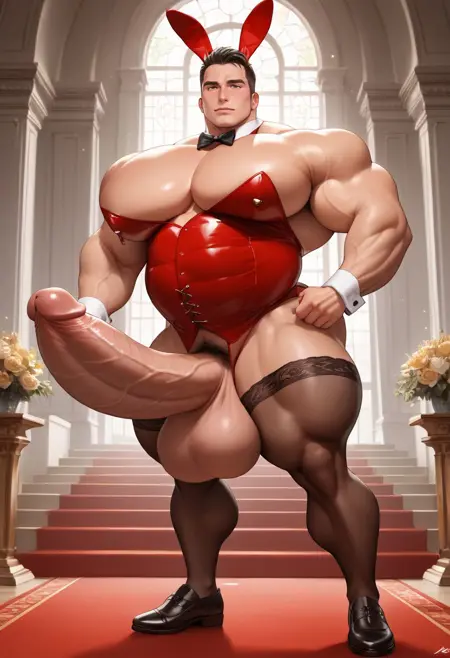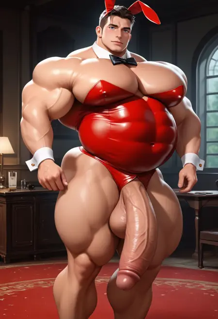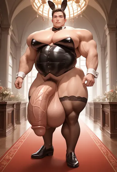 “hyper gut”标签能生成肌肉极其发达、腹部巨大的男性,你还可以在提示词中加入“hyper muscles”、“hyper arms”、“hyper pecs”、“hyper thighs”等标签,使角色更加魁梧。