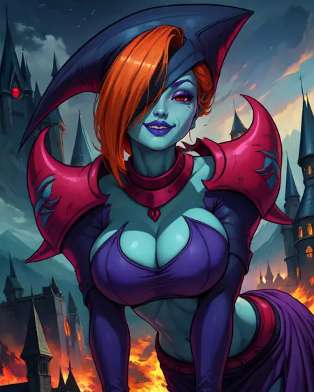 Veran, blue skin, hair over one eye ,red eyes, orange hair, blue lips,