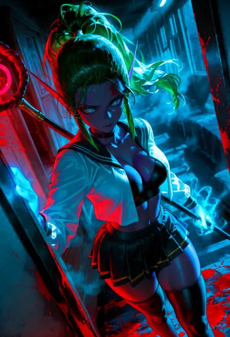 1girl, ダークエルフ, 色付きの肌, 灰色の肌, 紫色の肌, 灰色の目, 尖った耳, 長い髪, サイドロックス, 緑色の髪, 高いポニーテール, 髪をまとめた, 額, 中程度の胸, (太ももが太い:1.3), 広い hips,