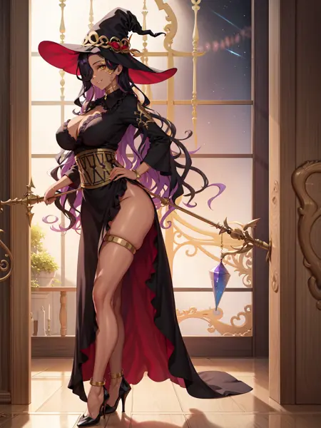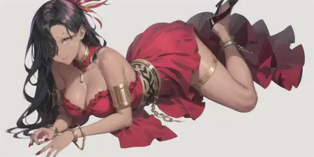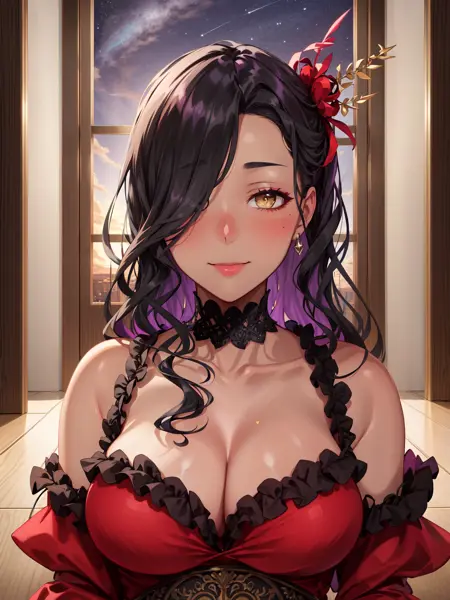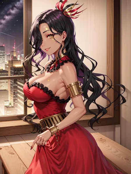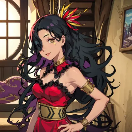 karumen, 1girl, solo, long hair, looking at viewer, hair ornament, dress, cleavage, jewelry, hair over one eye, bracelet, red dress, feathers, armlet, anklet, thighlet, yellow eyes, black hair, purple hair,dark skin,