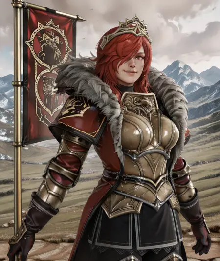アーマー、手袋、毛皮の縁取り、胸当て、太ももまでの長靴、すね当て、赤いコート、頭冠、