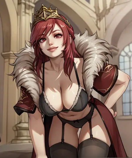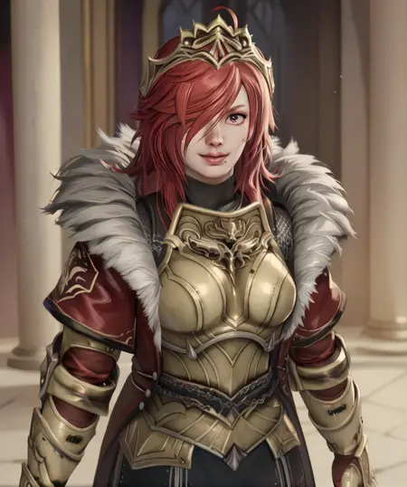 armor, gauntlets, fur trim, breastplate, thigh-highs, greaves, red coat, head crown,