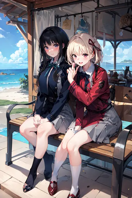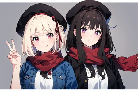 推荐的权重0.8,记得打上关键词Chisato and Takina,2girls,然后有一定概率眼睛颜色画不对,有时候会出来单个人物或者两个相同人物,所以需要一定的抽卡,不过抽出来的效果还是不错的,然后这lora还有点崩手,需要注意,训练集里图很丰富,许多服装都能画,可以参考例图,瑟瑟的也是可以的,既可以百合也可以盖饭。