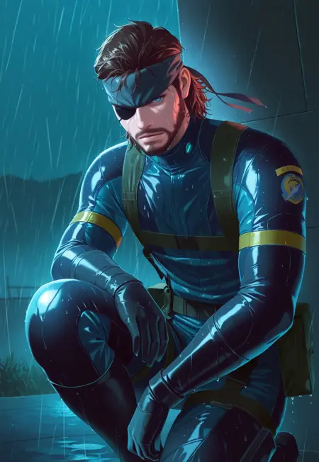 Peace Walker/Ground Zeroes: mature, brown hair, blue eyes, brown beard, brown mustache, eyepatch, bandana, armored suit, stealth suit, leather jacket.