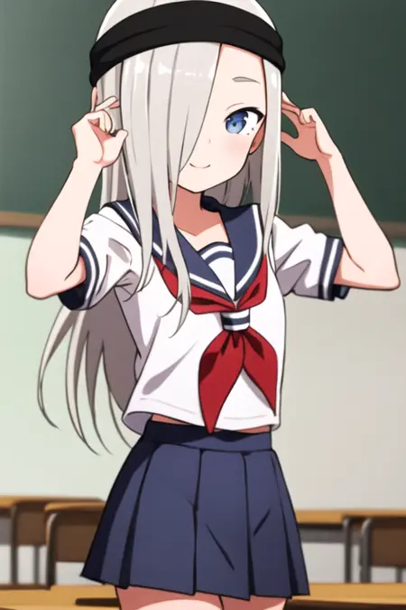 kunoichi_hototogisu, blue eyes, gray hair, long hair, hair over one eye