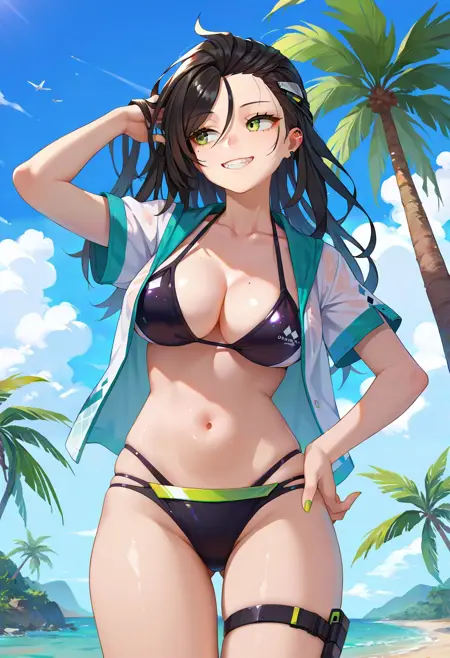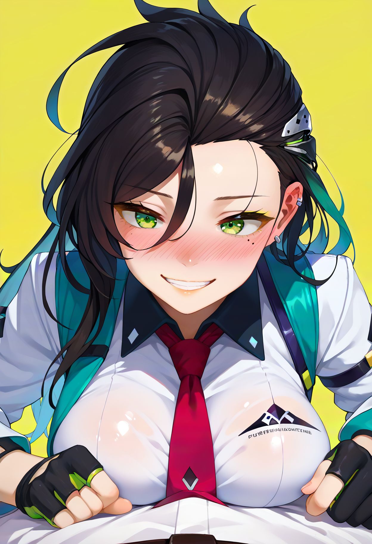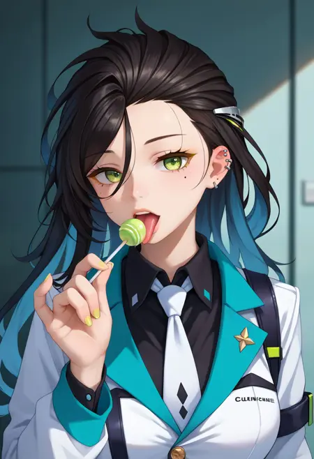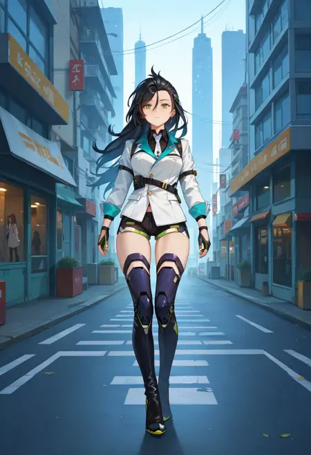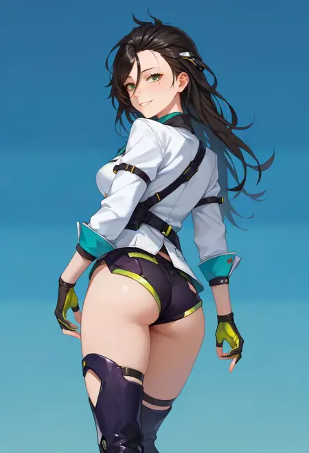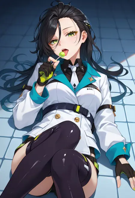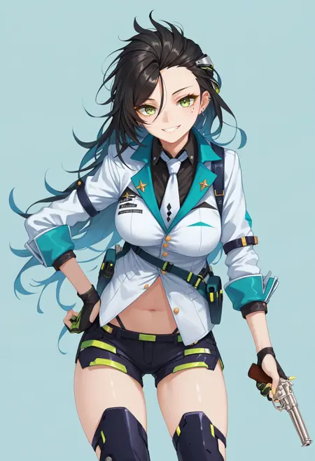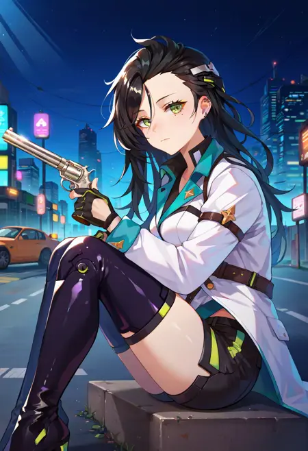 基础提示词:python_(girls_frontline), 1girl, solo, long hair, breasts, black hair, thighhighs, long sleeves, hair between eyes, green eyes, white jacket, shorts, black gloves, fingerless gloves, high heel boots, mole under eye