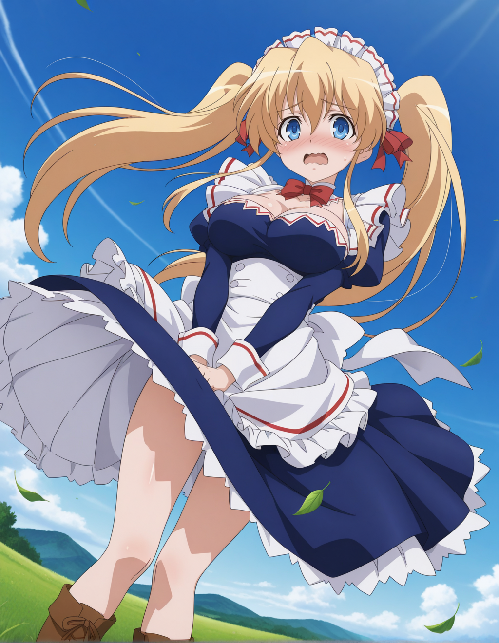 1girl, lizletlchelsie, 금발 머리, 화려한 파란 눈, 큰 트윈테일, 큰 가슴, 빨간 트윈 헤어보우, 메이드 헤드기어, 파란 드레스, 흰 허리 앞치마, 가슴선, 허리 앞치마, 줄리엣 소매, 긴 소매, 빨간 테두리, 흰 프릴, 주름진 베르타 칼라, 빨간 넥타이, 분리형 흰 칼라