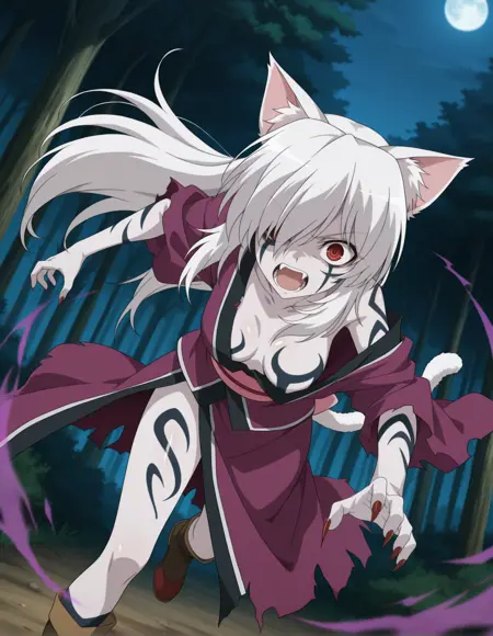ayakashimodehimari, 몬스터 소녀, 한쪽 빨간 눈을 가린 머리, 날카로운 이빨, 미친 듯한 눈빛, 검은 얼굴 페인트, 검은 몸 페인트, 창백한 피부, 매우 긴 흰 머리, 흰 고양이 귀, 흰 고양이 꼬리, 사이드 슬릿 키모노, 찢어진 옷, 분홍색 오비, 자홍색 키모노, 어깨 드러냄, 부츠, 발톱