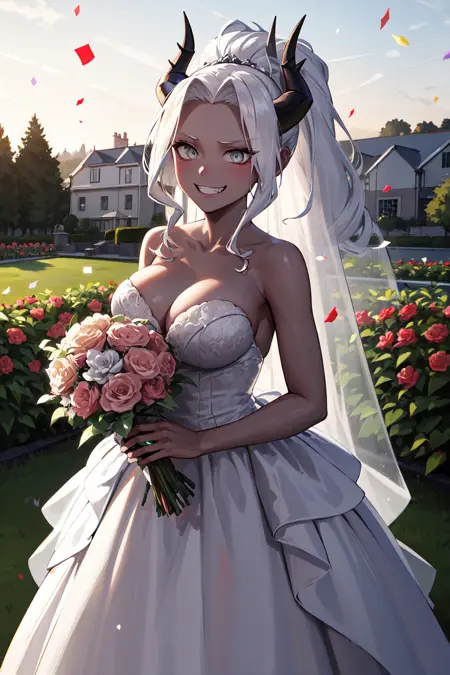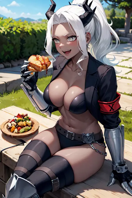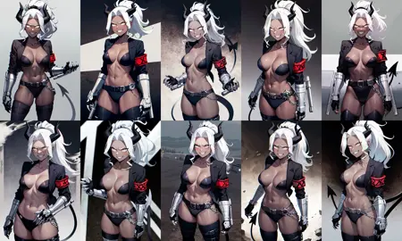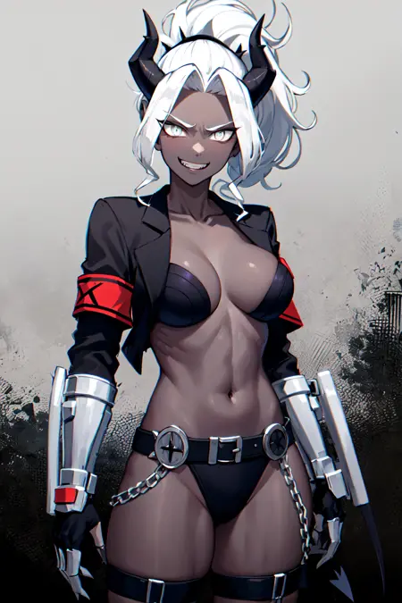 아우트핏1aajudge, 긴 머리, 말꼬리, 하얀 눈, 검은 피부, 악마 꼬리, 실크뼈, 검은 재킷, 짧은 재킷, 드러난 옷, 팔찌, 장갑, 검은 벨트, 속옷, 검은 허벅지 호스