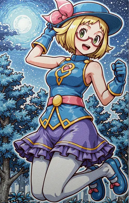 hairclip, hat, blue headwear, sleeveless shirt, blue shirt, pink belt, blue gloves, purple skirt, miniskirt, frilled skirt, white pantyhose, mary janes, blue footwear, footwear bow