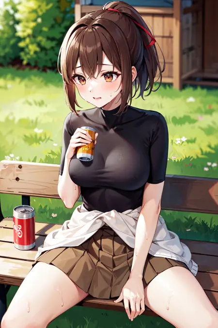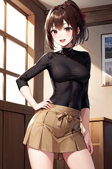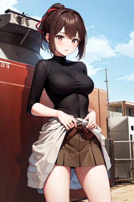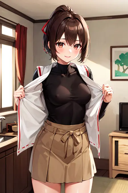 Ise outfit3hyuugaise, short hair, ponytail, hair ribbon, black shirt, skin tight, brown skirt, clothes around waist