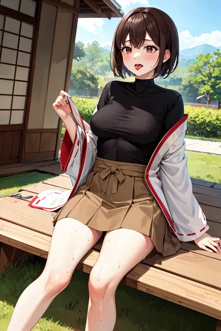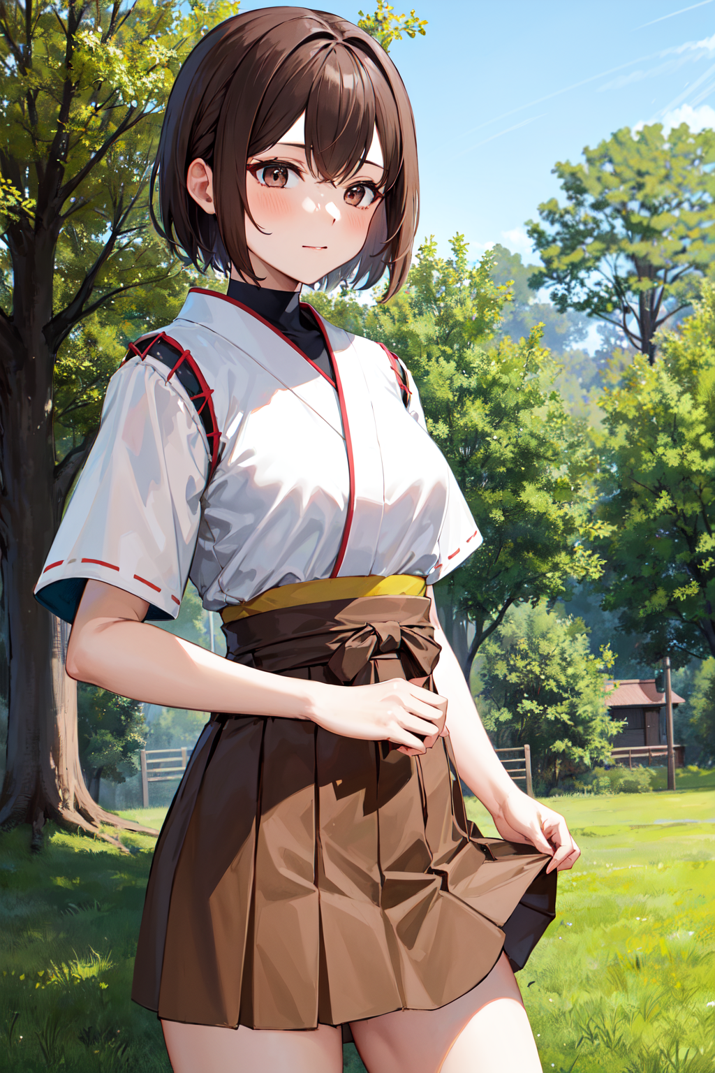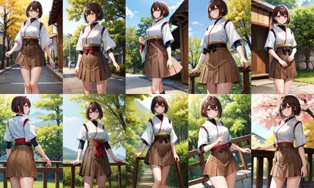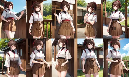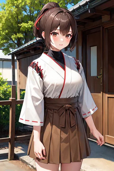 Ise outfit1hyuugaise, short hair, ponytail, hair ribbon, japanese clothes, short sleeves, hakama skirt, brown skirt
