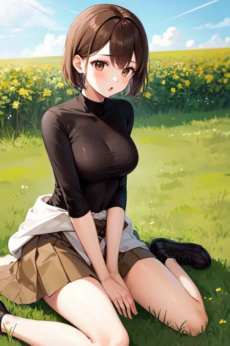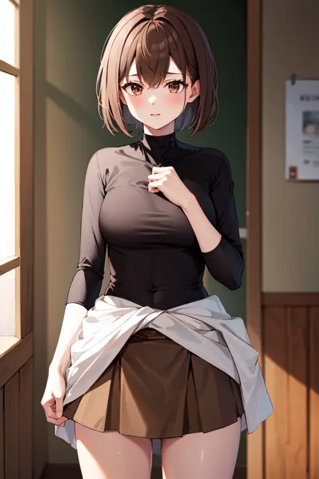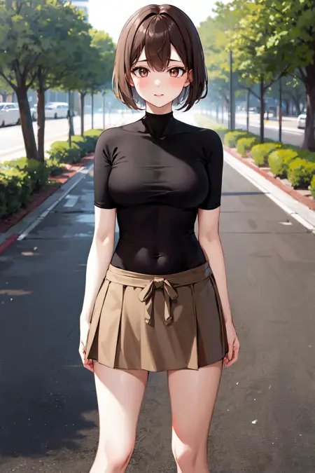 hyuuga outfit3hyuugaise, short hair, black shirt, skin tight, brown skirt, clothes around waist