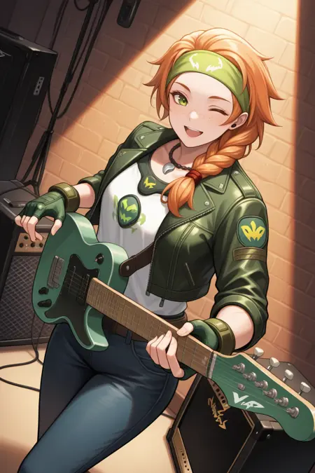 Appearance : vsk, muscular female, freckles, orange hair, green eyes, long hair, braided ponytail, hair over shoulder, hair tie, eyebrow piercing, earrings, green headband, necklace
