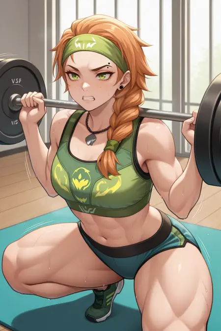 | 训练词汇 | vsk, muscular female, freckles, orange hair, green eyes, long hair, braided ponytail, hair over shoulder, hair tie, eyebrow piercing, earrings, green headband, necklace已复制! green tank top, black undershirt, bare shoulders, single arm warmer, brown belt, multiple thigh straps, belt pouch, green pants, thigh pouch, knee pads, black boots, green gloves, fingerless gloves已复制! |