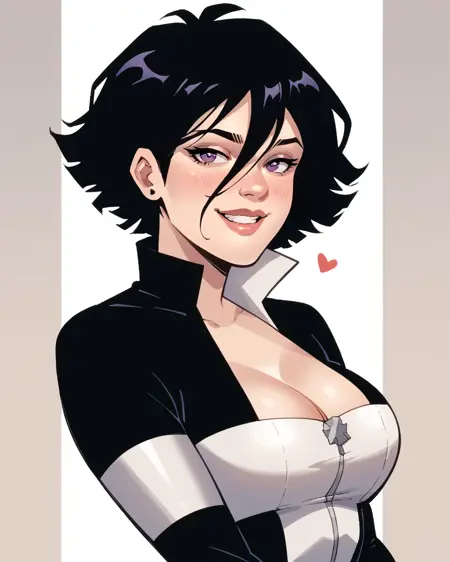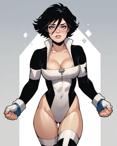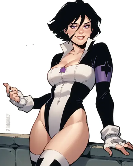 Triggers: atlee, black hair, short hair, purple eyes, leotard, thighhighs, cleavage, fingerless gloves