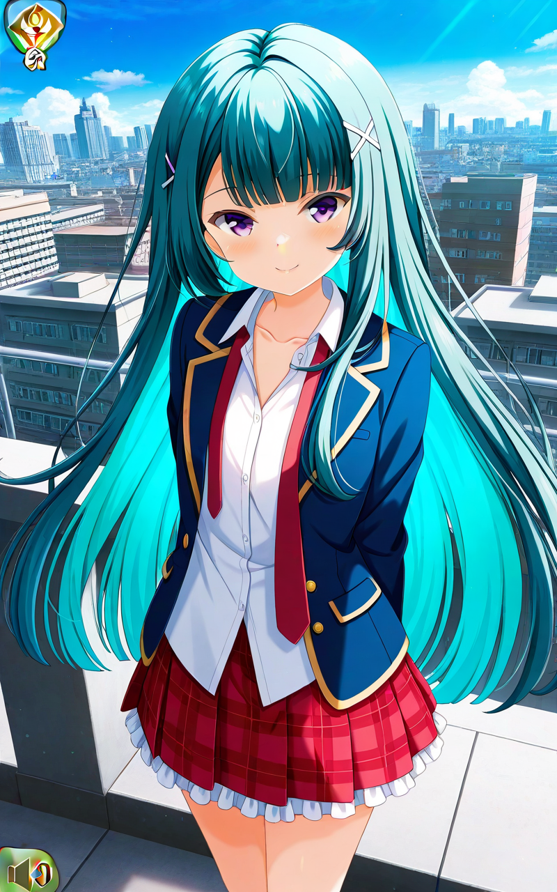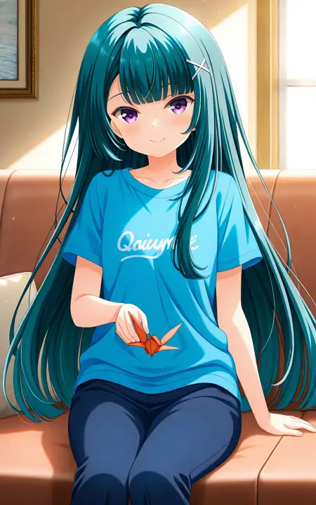トリガー単語: chiyouraayame、青緑色の髪、直線的な前髪、ヘアクリップ、x ヘアアクセサリー、非常に長い髪、紫の目