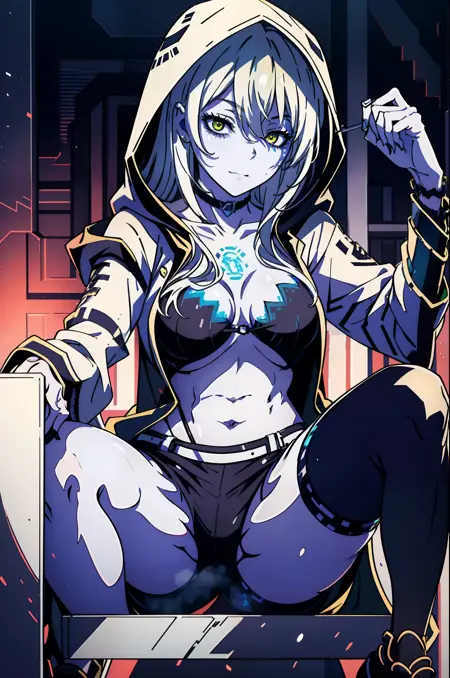 触发词: LokiKamikatsu, 白皙皮肤, 带帽外套, 数字服装, 数字项圈, 数字眼罩