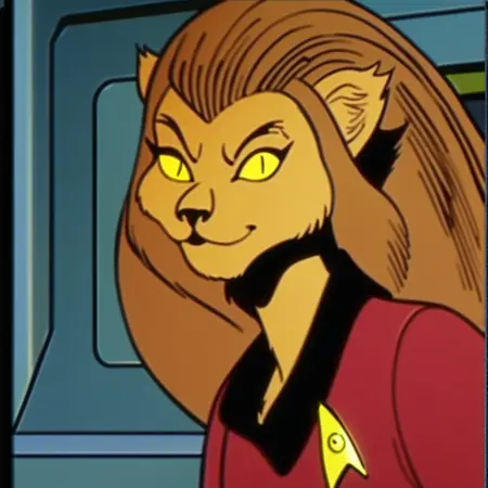 이것은 1970년대 스타트렉 애니메이션 시리즈의 리턴턴트 미레스입니다. 그녀는 케이션인으로, 인간처럼 고양이/사자 같은 외계인입니다. 통신관으로서 그녀는 우주선(엔터프라이즈)의 통신 장치를 운영했습니다.