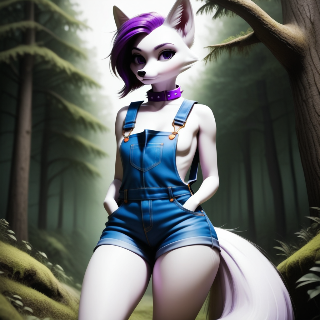 然后是蓬松的白色狐狸尾巴,穿着裸体背带短裤,