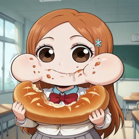 基本プロンプト: ちびスタイル、誇張された目、誇張された表情、ふくらんだほお、丸いほお、食べている、口に詰め込んだ、食べ物の汚れ、顔に食べ物、よだれ、かわいい、コミックな表情、バカげた顔、アニメ調、丸い目、閉じた口、噛んでいる、かみかみしている、持っている、食べ物を持っている、食べている、手に食べ物、ミーム顔、面白い顔、ミーム