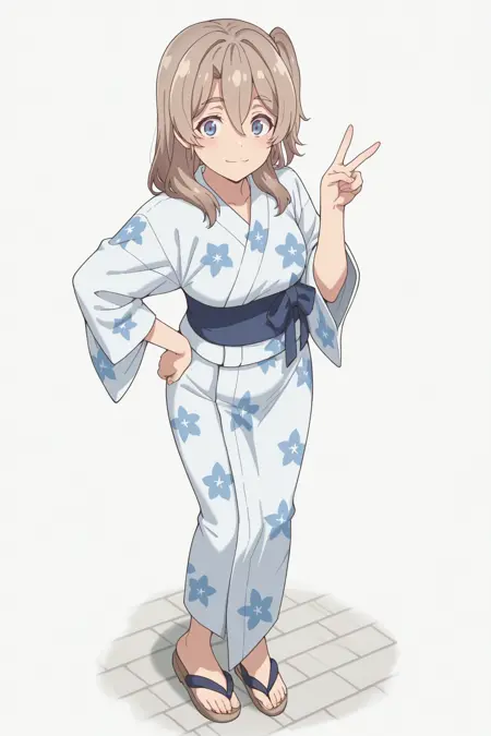 外見: 茶色の髪、長い髪、青い目、片側を上げている、目の間の髪、濃い眉