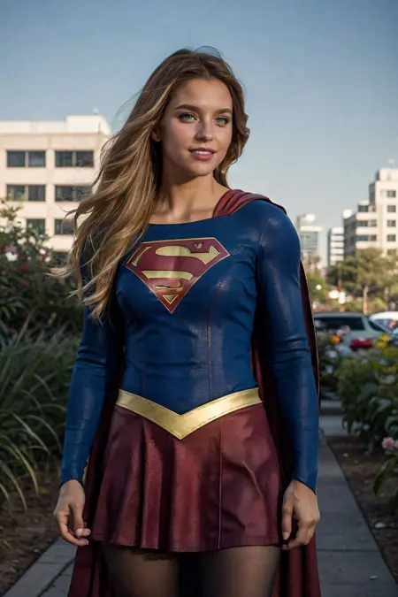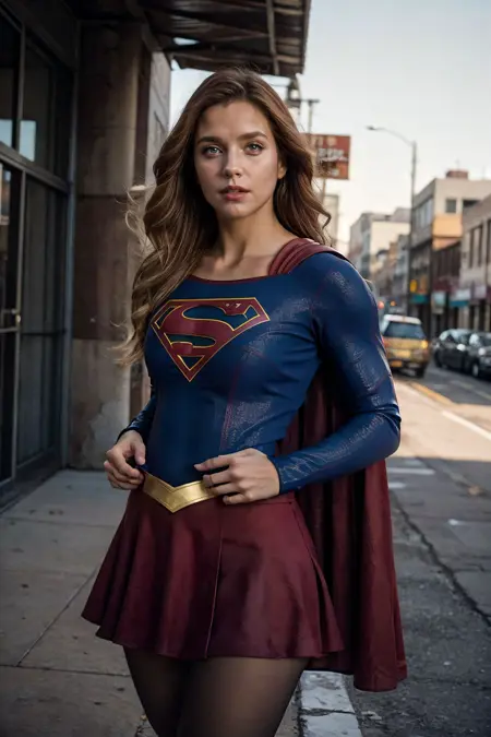 SD肯定プロンプト: LORA, realistic, masterpiece, realistic, detailed, 8k, 1girl, beautiful photography of supergirl, superhero, realistic, red cape, bodysuit, red skirt, red boots, pantyhose, blue eyes, blonde hair, lips, long hair, smile...