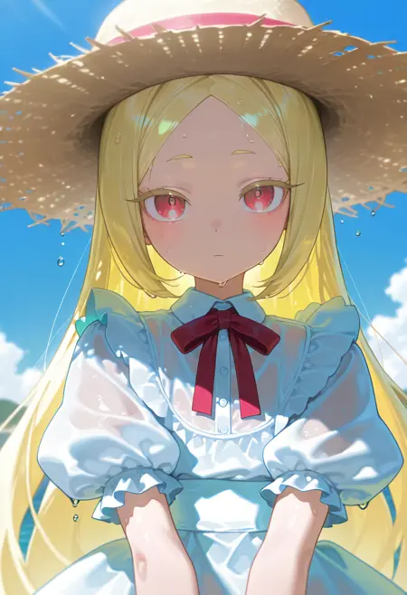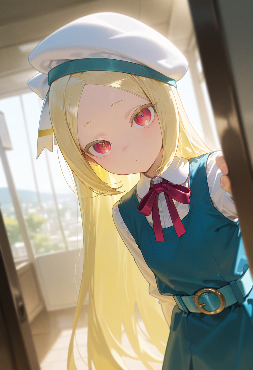 她的外貌标签: 1girl, solo, 长发, 金发, 红眼, 极长发, 分开的刘海, 额头标记, 金色睫毛, 大眉毛