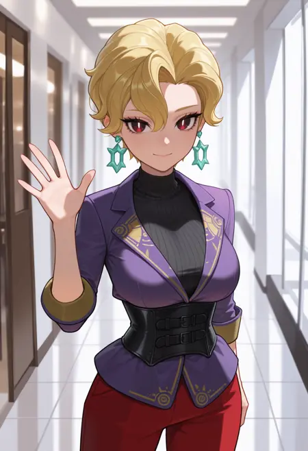 デフォルトの衣装: パープルのジャケット、肘より長い袖、黒いセーター、リブ編みのセーター、黒いコルセット、黒いベルト、赤いズボン、イヤリング
