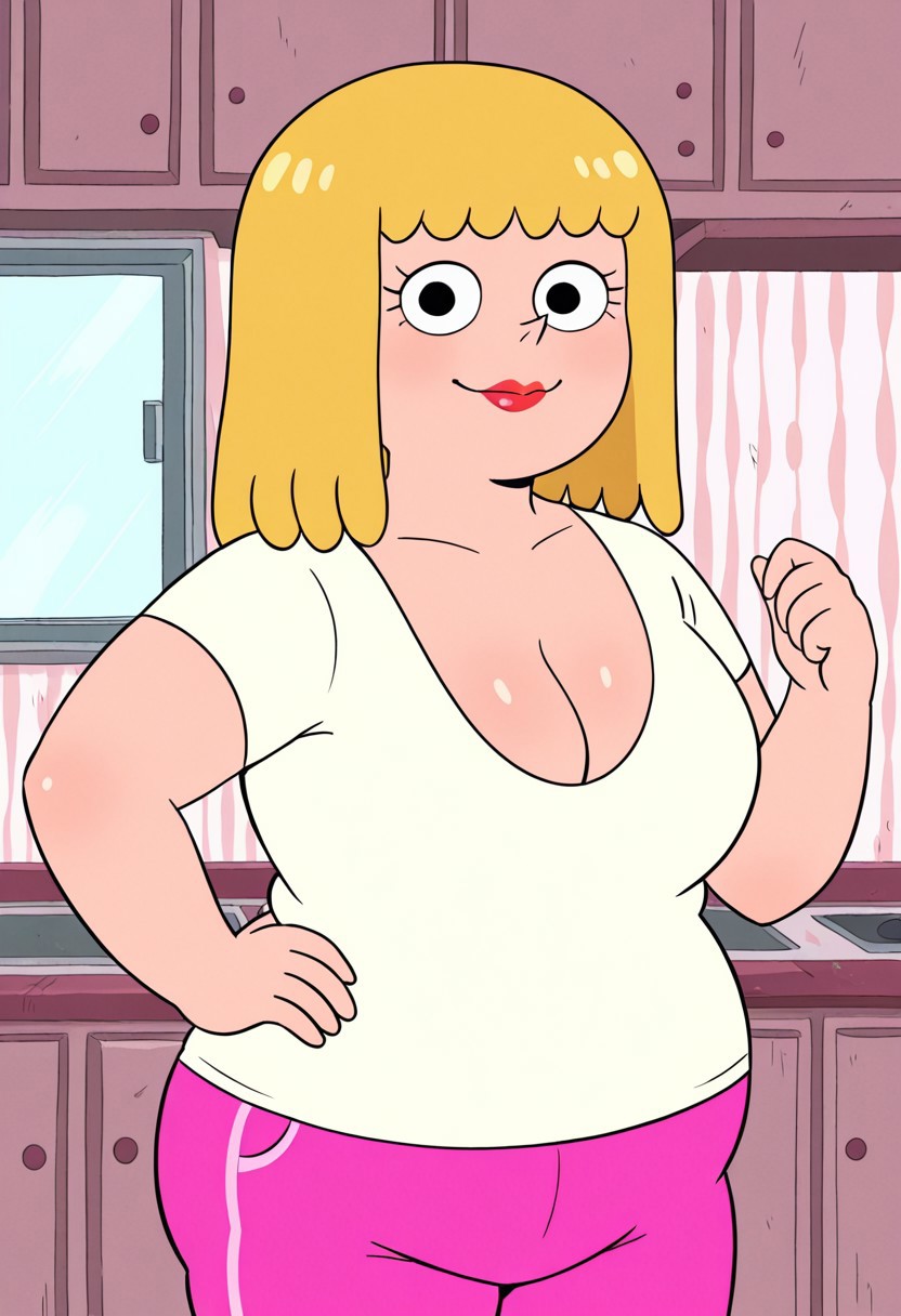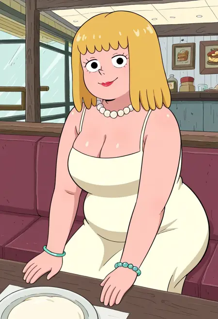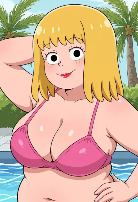 1girl, solo, MaryW_C, 연한 분홍색 피부, 검은 눈, 금발, 중간 길이 머리, 곧은 머리, 빨간 립스틱