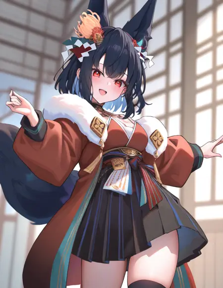 ag-hokutou,fox ears,hair ornament,black hair,red eyes,medium hair, floating hair, fox tail, halo