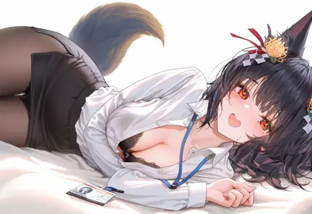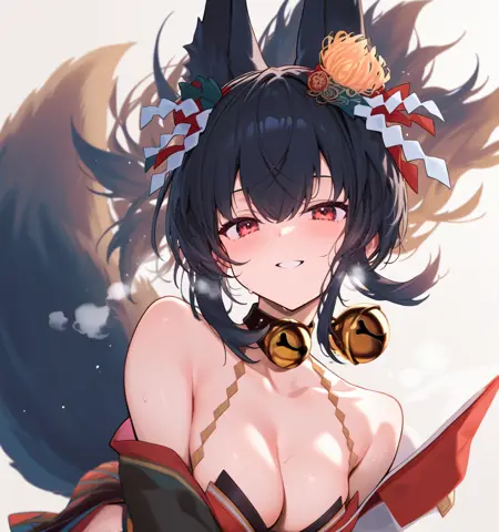 ag-hokutou,fox ears,hair ornament,black hair,red eyes,medium hair, floating hair, fox tail, halo