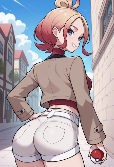 기본 옷차림: 갈색 재킷, 벌어진 재킷, 긴 소매, 빨간 스웨터, 리브 스웨터, 터틀넥 스웨터, 크롭 스웨터, 흰색 반바지, 짧은 반바지, 흰색 벨트, 벨트 버클, 복부, 배꼽