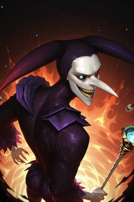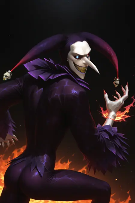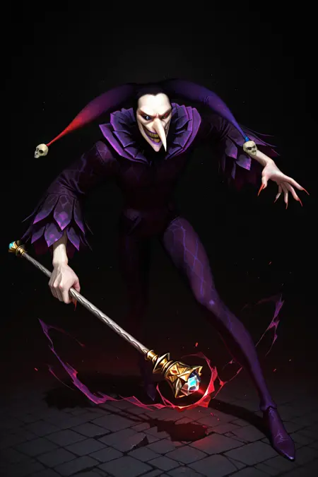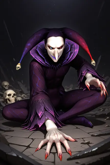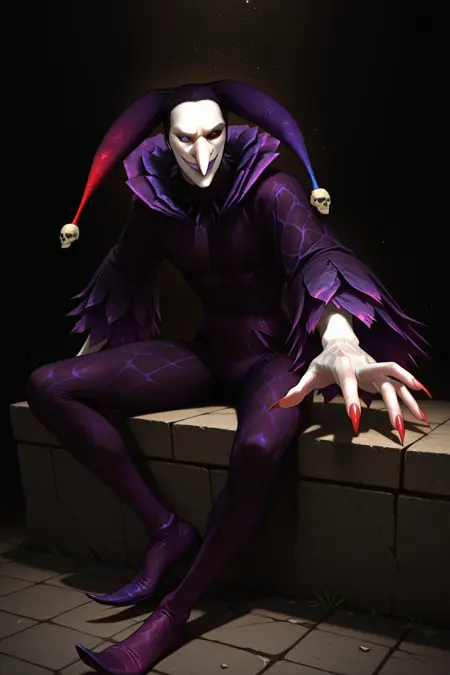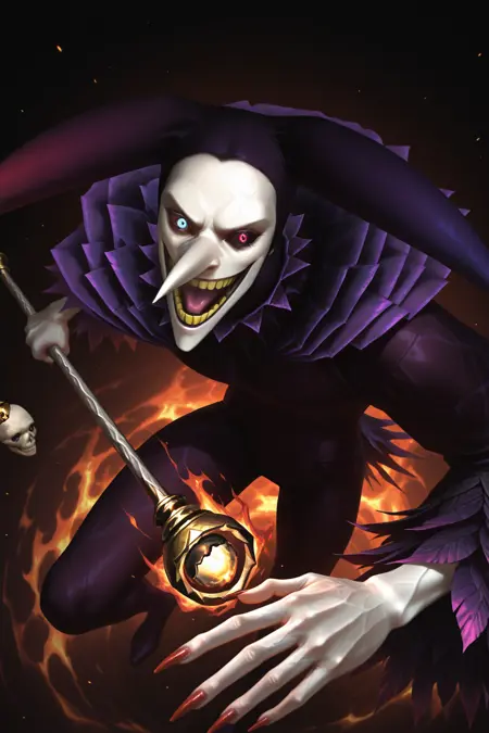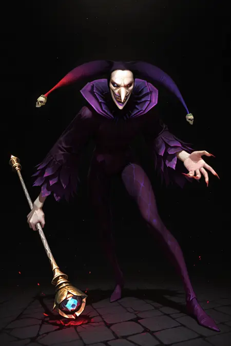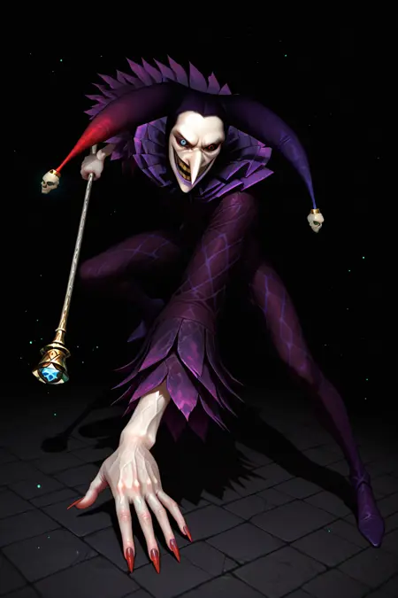 - JEST3R, 어두운 재미꾼 모자, 두개골 모양 액세서리, 주름진 목칼라, 정맥이 드러난 하얀 피부, 미친 듯한 미소, 노란 치아, 매우 긴 코, 어두운 보라색 바디슈트, 넓은 소매, 깃털 장식, 긴 빨간 손톱, 빨간색과 파란색 이안색, 검은 공막, 지팡이를 들고 있음