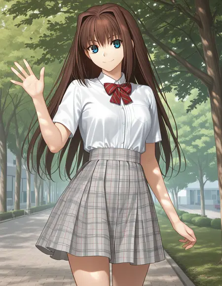 school uniform, blazer, white shirt, red bow, brown skirt, pleated skirt