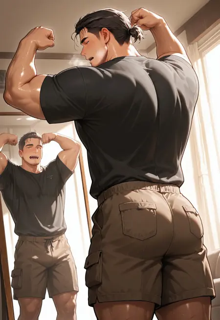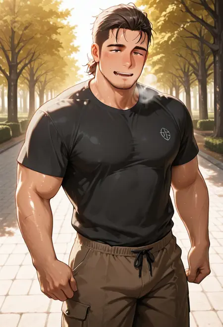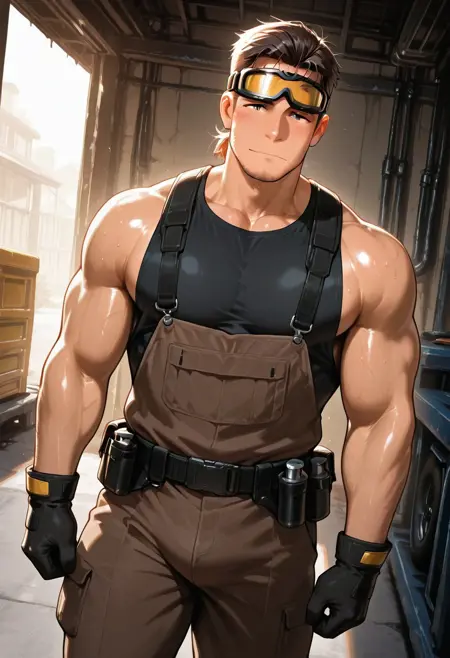 promp: mbti_istp, 1male, messy tied-up brown hair, yellow goggles on forehead, yellow bomber jacket, brown overalls, black gloves, tool belt with wrench, black combat boots, confident pose, mechanic aesthetic
