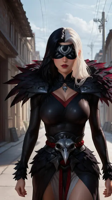 Pharsaven,双色头发,黑色头发,白色头发,长发,带有符号的黑色面罩,遮住眼睛,红色唇膏,鸟头骨项链,紧身连衣裙,混搭面料与盔甲,肩部和手臂有黑色羽毛
