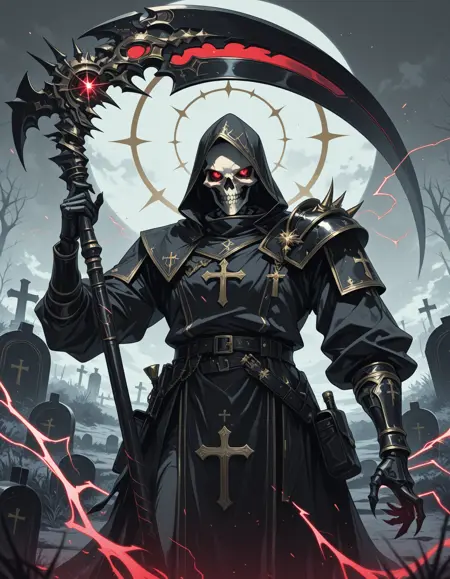 "masterpiece, best quality, good quality, very aesthetic, absurdres, newest, 8K, depth of field, focused subject, dynamic angle, close up, golden order, Tall skeleton reaper, hooded, red glowing eyes, wearing adorned armor, dynamic pose, holding scythe weapon, electricity sparks, holofoil glitter, faint, glowing, scary, otherworldly glow, graveyard in background"