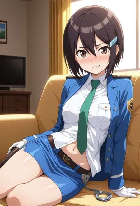 policewoman, police uniform, blue jacket, long sleeves, white shirt, untucked shirt, green necktie, white gloves, handcuffs, navel, midriff, belt, miniskirt, blue pencil skirt, holster,