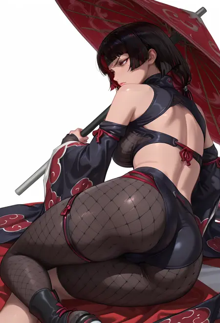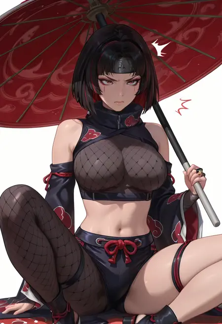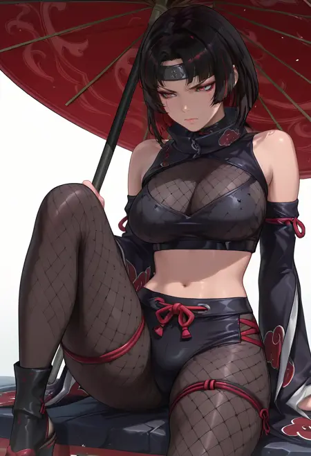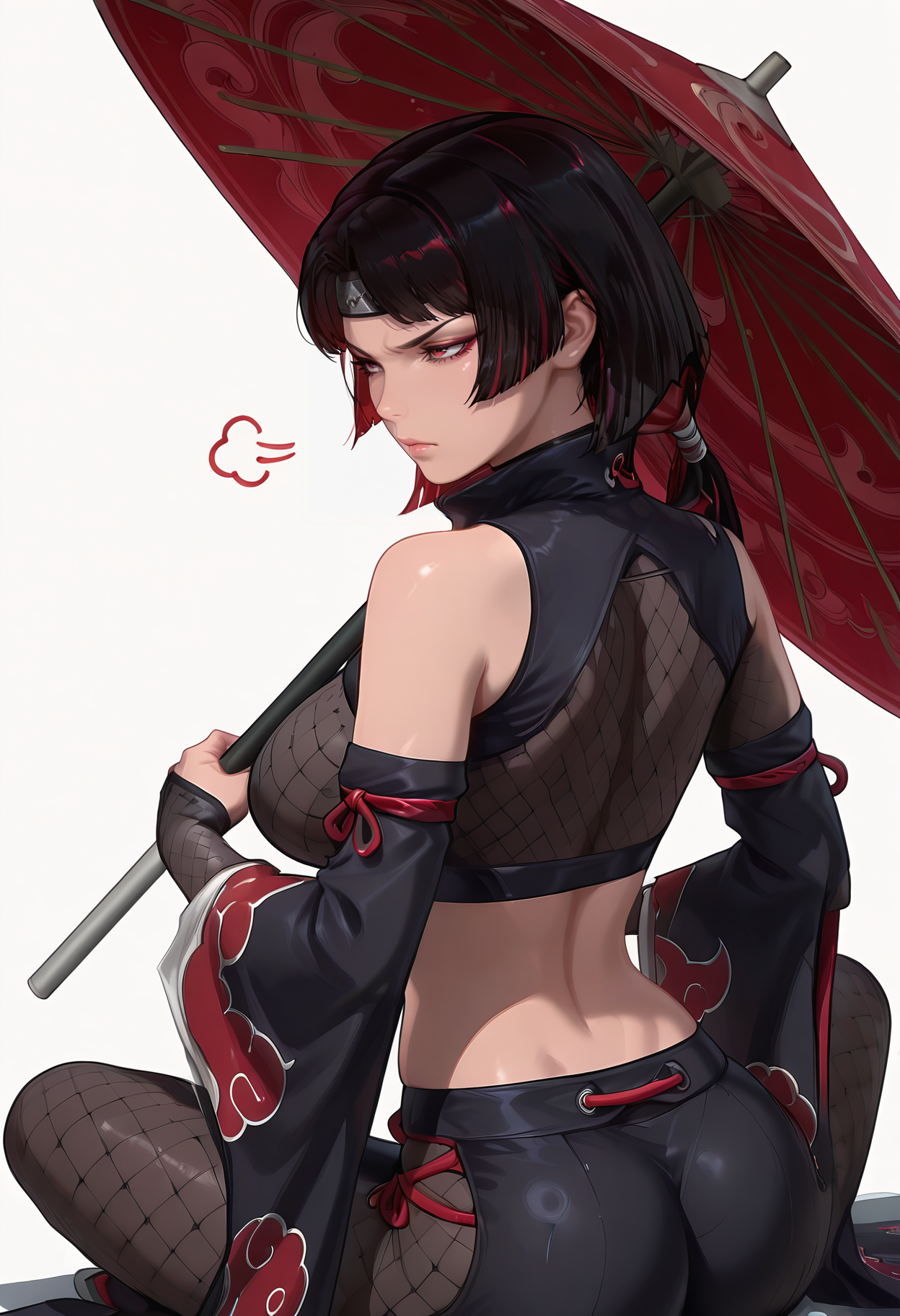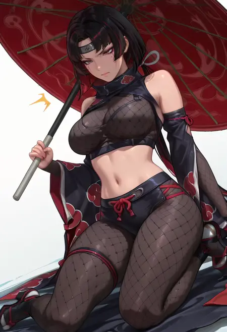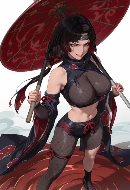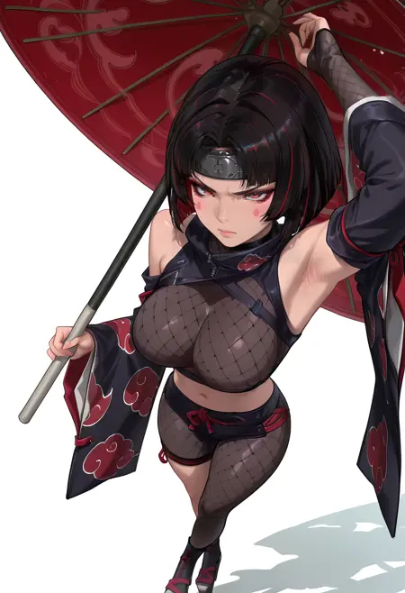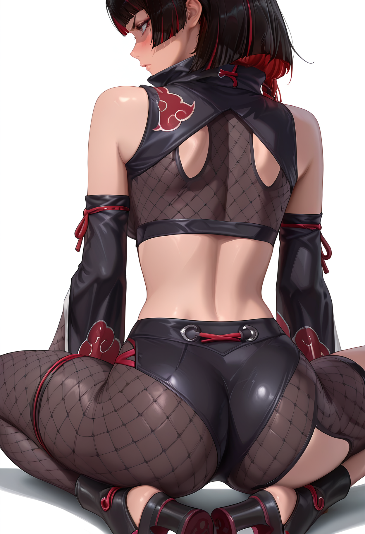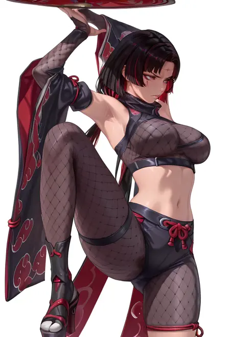 1girl, fishnets, black hair, multicolored hair, wide sleeves, midriff, red hair, detached sleeves,thigh strap,single leg pantyhose,platform footwear,